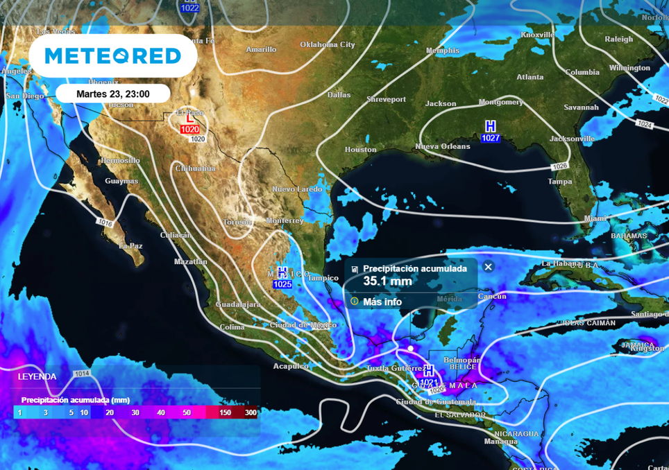 Se prevén vientos fuertes de componente norte, que dan paso a un efecto "Tehuantepecano" con rachas de 80 km/h en el Istmo y Golfo de Tehuantepec.
