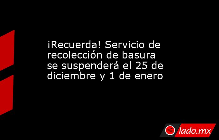 Con motivo de la celebración de las fiestas decembrinas, el Gobierno Municipal, a través de la Dirección de Servicios Públicos Municipales recuerda a la población en general que los días 25 de diciembre y 1 de enero, el servicio de recolección de basura se suspenderá.