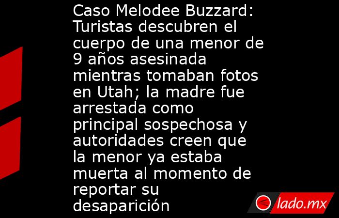 Melodee Buzzard tenía 9 años. Fue reportada como desaparecida tras ser vista por última vez hace aproximadamente dos meses en el condado de Santa Bárbara, California. De acuerdo con las autoridades, el último registro de la menor con vida ocurrió el 9 de octubre, cuando se encontraba en una parada de descanso cerca de la frontera entre Utah y Colorado.