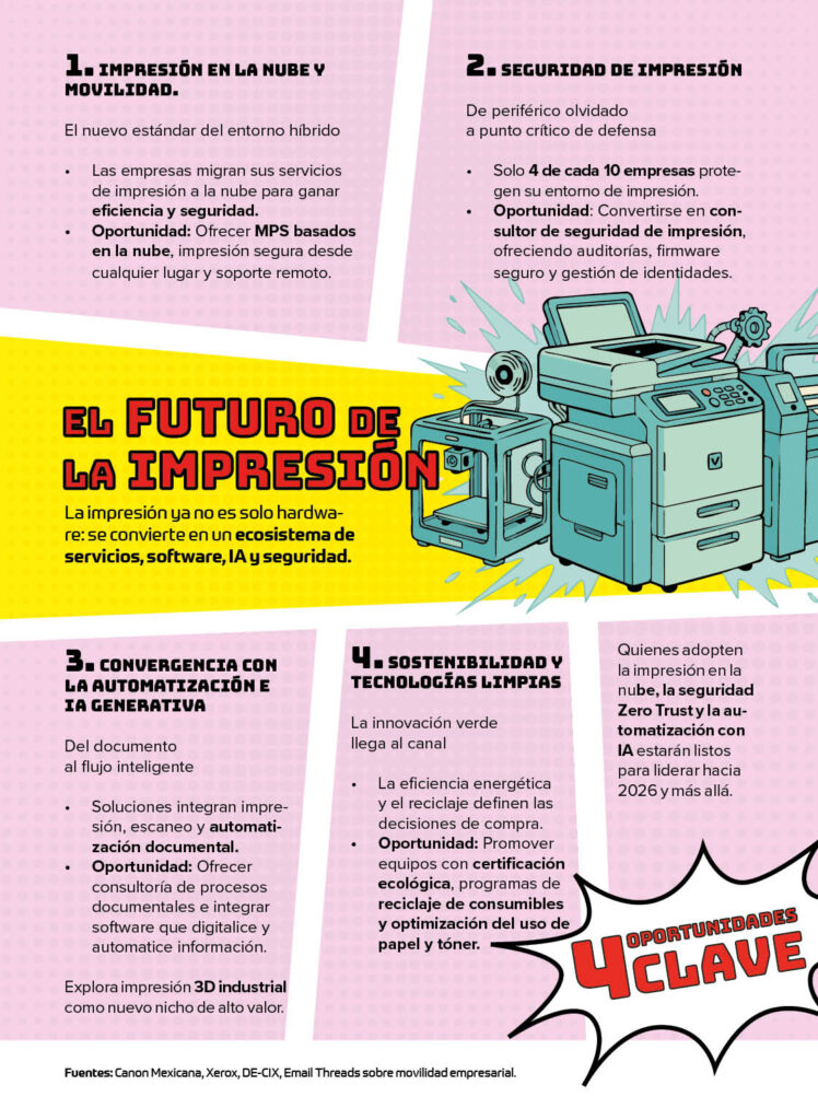 La industria de la impresión atraviesa una transformación profunda. De ser un negocio centrado en hardware, evoluciona hacia un ecosistema de servicios, software, inteligencia artificial y ciberseguridad, lo que abre nuevas oportunidades para integradores y revendedores de tecnología en México Infografía.