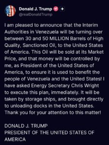 El anuncio fue realizado a través de su plataforma Truth Social, donde el mandatario detalló que el crudo será vendido a precio de mercado, y que los ingresos generados serán administrados directamente por él para asegurar su uso “en beneficio de ambos pueblos”.