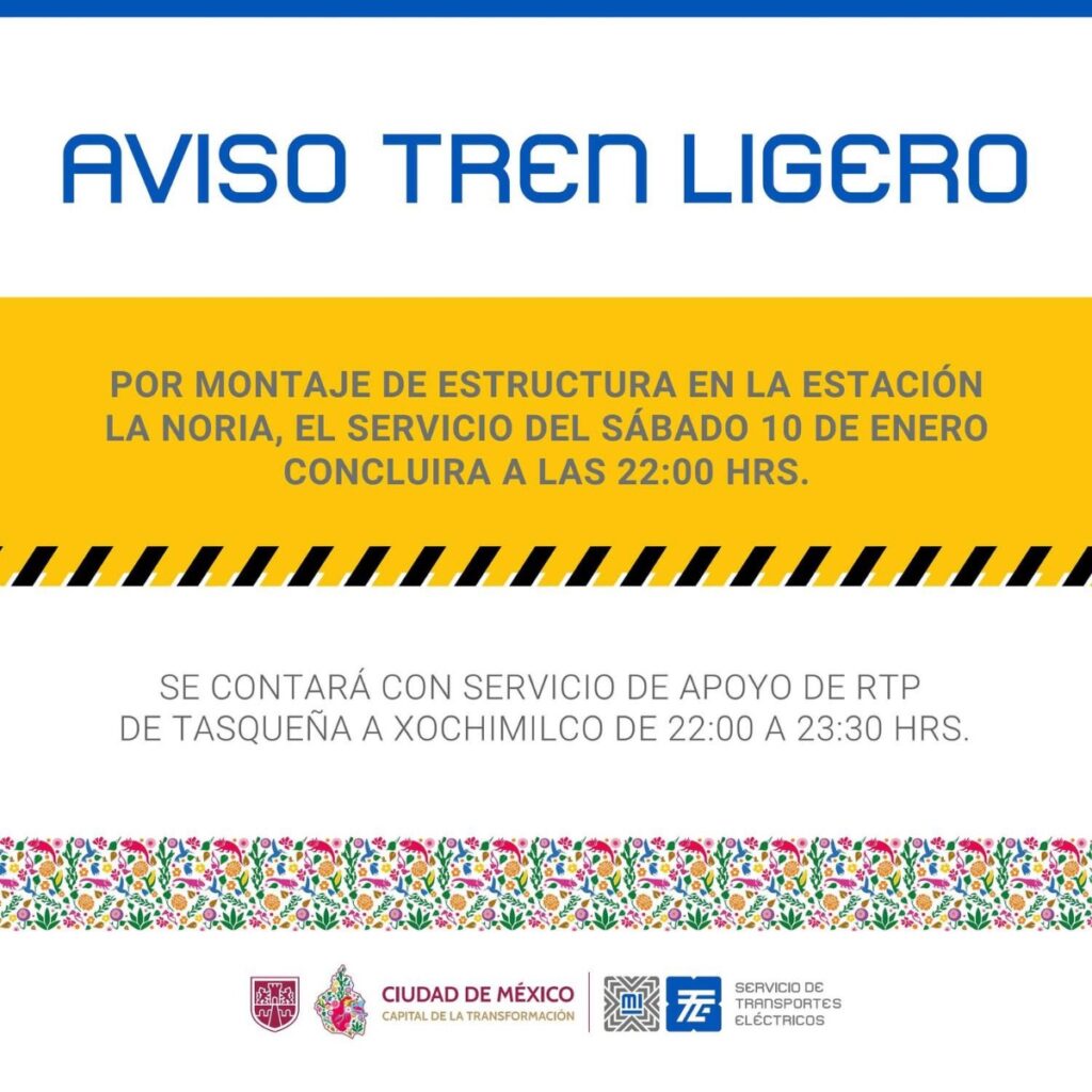 El secretario de Movilidad de la Ciudad de México, Héctor Ulises García Nieto, informó que el servicio del Tren Ligero será suspendido este sábado 10 de enero a partir de las 22:00 horas, debido a trabajos de remodelación en una de sus estaciones.