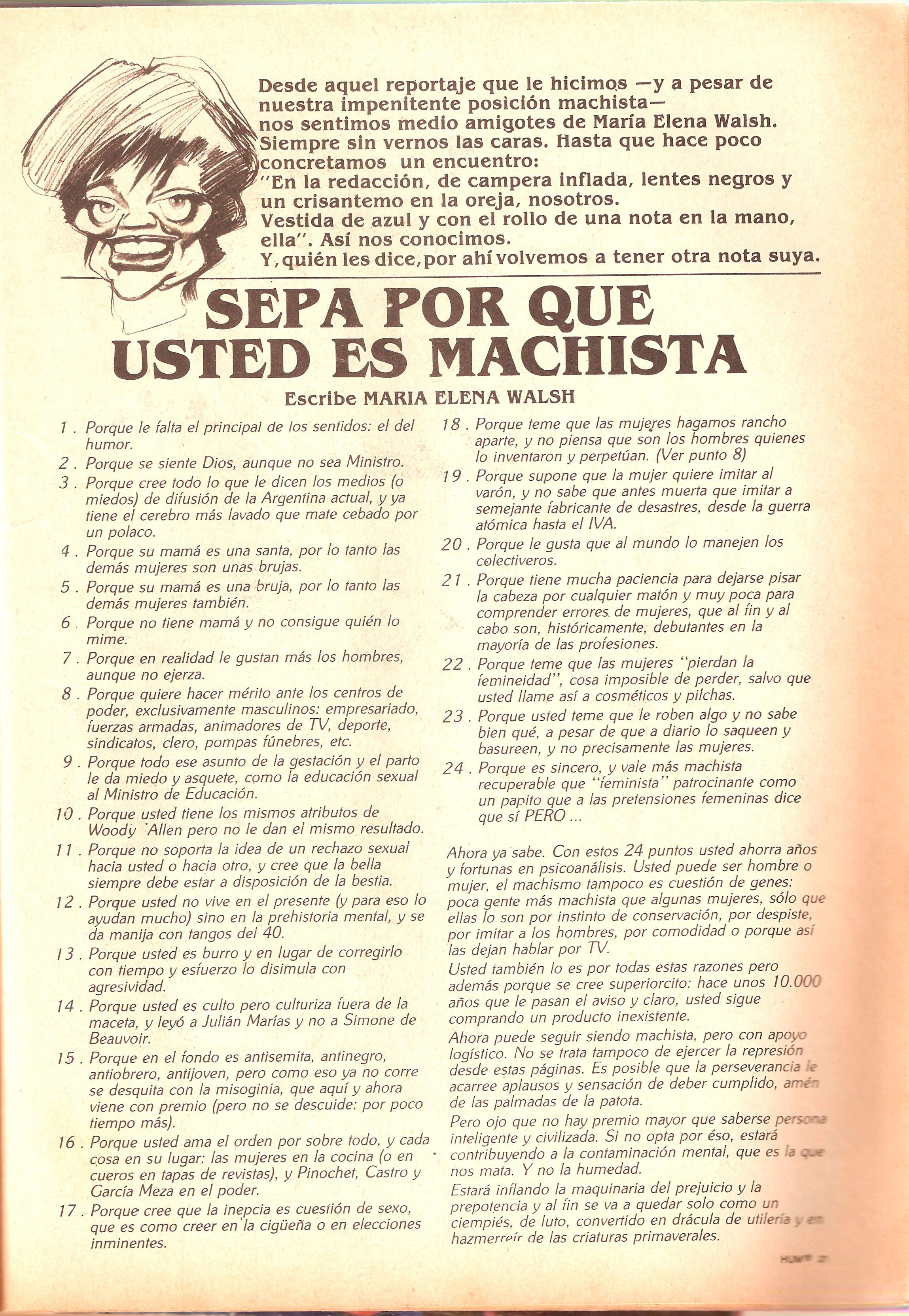 Allí, entre artículos, fotos y textos de firmas célebres, quien llegaba se daba de narices con la reproducción a gran escala de una página de la Revista Humor —editada desde junio de 1978, con la oscuridad y la censura más espesa de la dictadura cívico-militar como contexto, hasta octubre de 1999 por Ediciones de la Urraca—. Aquella página publicada en 1980 —quizás la más conocida entre los textos feministas de María Elena Walsh— era presidida por una caricatura de la artista y se titulaba: “Sepa por qué usted es machista”. A continuación deplegaba, a la suerte de decálogo, más de una veintena de razones que la autora esgrimía.