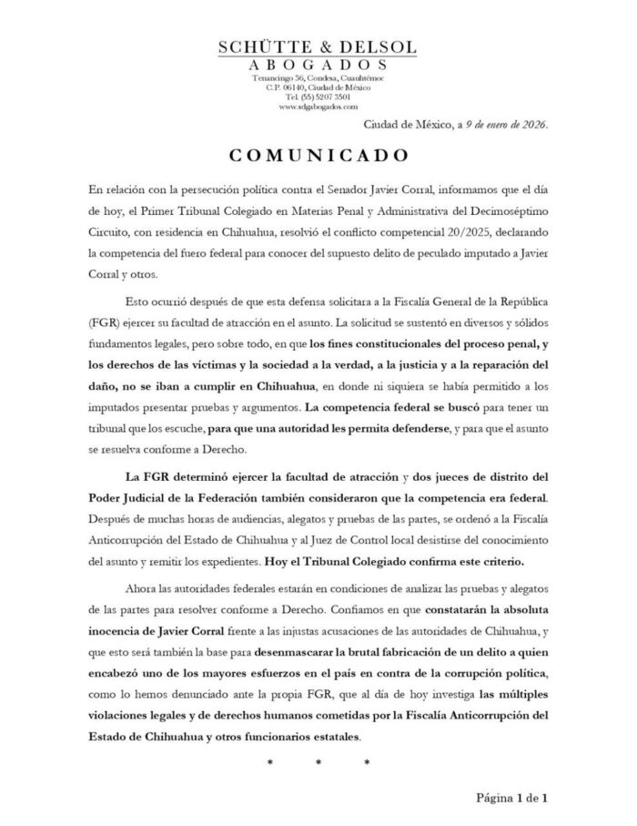 De acuerdo con un comunicado emitido por Schütte & Delsol abogados, el Primer Tribunal Colegiado en Materias Penal y Administrativa del Décimo Séptimo Circuito, con sede en Chihuahua, resolvió el conflicto competencial y determinó que el caso debe ser atendido por autoridades federales.