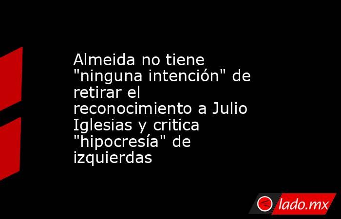 El alcalde de Madrid, José Luis Martínez-Almeida, ha confirmado que no tiene "ningún intención en estos momentos" de retirar la distinción de Hijo Predilecto de la ciudad al cantante Julio Iglesias, ha criticado la "hipocresía" de la izquierda y ha instado a la portavoz de Más Madrid, Rita Maestre, a que mire hacia su excompañero Íñigo Errejón y los socialistas hacia el exsecretario de Investigación y Análisis del PSOE Francisco Salazar.