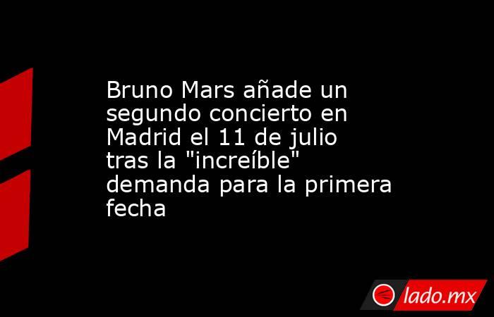 El cantante Bruno Mars ha añadido una segunda fecha en Madrid para el 11 de julio en su gira "The Romantic Tour", que le traerá a España ocho años después de su último concierto, tras la "increíble" demanda que ha despertado en la preventa su primera fecha en la capital (10 de julio).