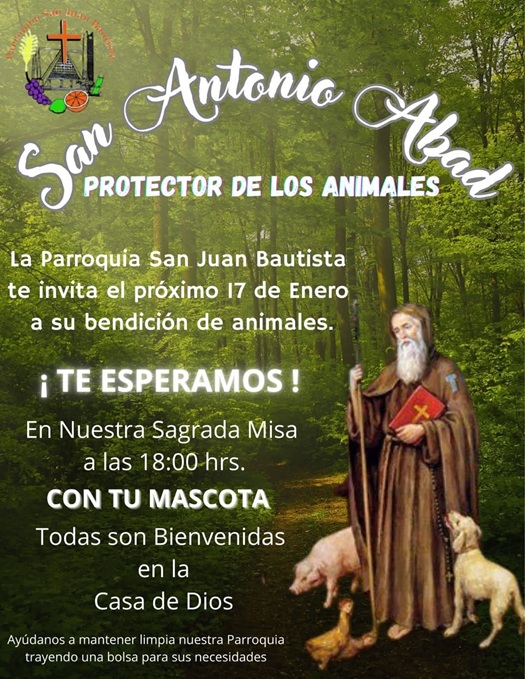 En el marco de la festividad de San Antonio Abad, protector de los animales, la Parroquia San Juan Bautista invita a la comunidad a participar en la Santa Misa y Bendición de Animales, que se llevará a cabo el sábado17 de enero a las 18:00 horas.