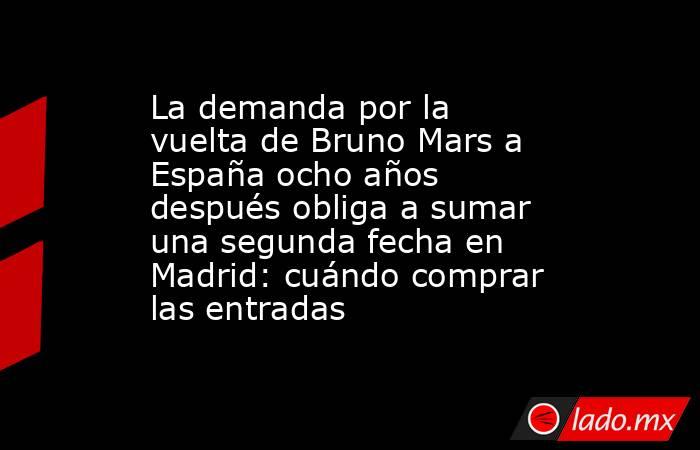 La última vez que Bruno Mars pisó España fue en 2018. El 20 y 22 de junio de hace ocho años, el cantante estadounidense actuó en el Estadio Olímpico Lluís Companys y el Wanda Metropolitano de la capital durante la gira 24K Magic World Tour. El artista confirmó su visita a España hace una semana con una cita que tendrá lugar el próximo 10 de julio en el mismo estadio, ahora llamado Riyadh Air Metropolitano. La demanda ha sido tal que este miércoles se ha confirmado una segunda fecha, también en Madrid al día siguiente, el 11 de julio.