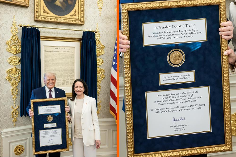 Machado utilizó un marco con detalles dorados para colocar la medalla del Nobel que obsequió al presidente y en la parte superior escribió: “en gratitud por su extraordinario liderazgo para promover la paz” y agregó que es un detalle del pueblo venezolano por sus acciones para encaminar “su libertad”, de acuerdo con fotos de la entrega en la Casa Blanca, difundidas por el New York Post.