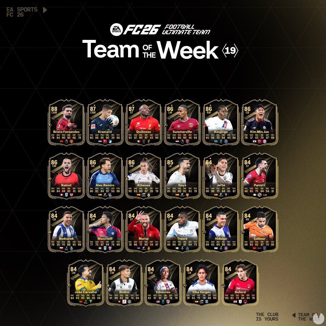 Son los siguientes:CAM - Bruno Fernandes: Manchester United - 88CAM - Andrej Kramaric: Hoffenheim - 87*ST - Julian Quiñones: Al-Qadisiyah - 87*LM - Crysencio Summerville: West Ham - 86*RW - Marveille Kanjinga: PSG - 86*CB - Kim Min Jae: Bayern Munich - 86CM - Adrien Rabiot: Milán - 86GK - Alex Remiro: Real Sociedad - 86RW - Athenea: Real Madrid - 86LB - Jose Gayà: Valencia - 85ST - Jefté: Albacete - 84ST - Troy Parrott: AZ Alkmaar - 84CB - Jan Bednarek: FC Porto - 84CM - Luca Mazzitelli: Cagliari - 84ST - Vedat Muriqi: Mallorca - 84LM - Hamed Traoré: Marseille - 84RW - Santiago Hidalgo: Toulouse - 84RB - Omer Ali Sahiner: Basaksehir - 84LM - Joao Carvalho: Estoril Praia - 84CM - Uran Bislimi: Lugano - 84CM - Lily Yohannes: OL Lyon - 84CB - Elba Vergés: Alavés - 84ST - Dom Ballard: Leyton Oriend - 84¿Qué es el Team of the Week?El Team of the Week (también conocido simplemente por las siglas TOTW), para quien no lo sepa, es un evento que EA Sports pone en marcha cada semana para darle más vida al Ultimate Team de EA Sports FC 26.
