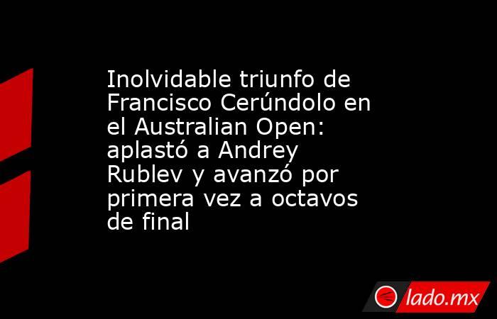 Francisco Cerúndolo avanzó por primera vez en su carrera a octavos de final del Australian Open al vencer al ruso Andrey Rublev por 6-3, 7-6 (4) y 6-3. Su próximo rival saldrá del cruce entre el alemán Alexander Zverev y el británico Cameron Norrie.