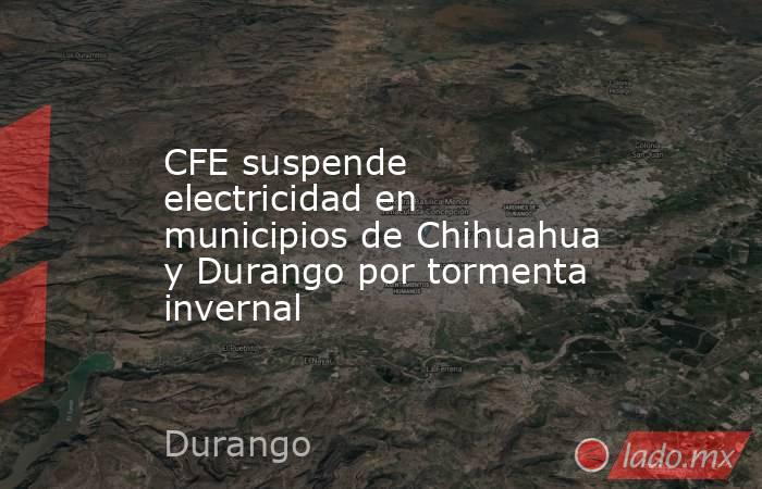 La Comisión Federal de Electricidad (CFE) informó que hace una hora fue necesario suspender de manera preventiva el suministro de energía eléctrica en varios municipios de Chihuahua y Durango, debido a las condiciones severas provocadas por la tormenta invernal, principalmente por la presencia de nieve, hielo y fuertes ráfagas de viento.