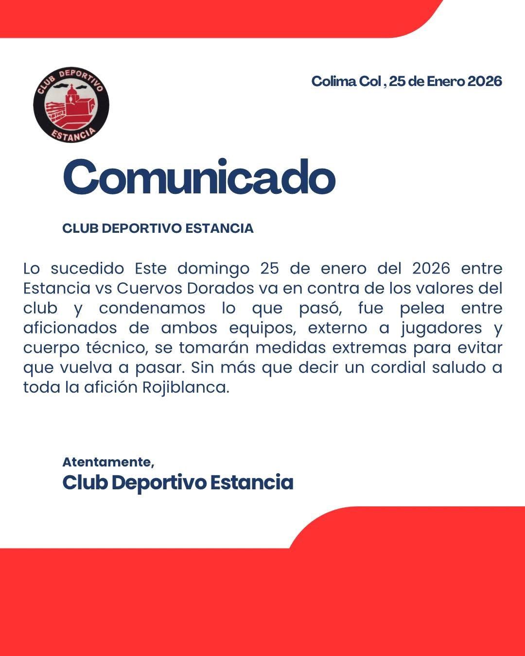 La directiva fue enfática al señalar que “lo sucedido este domingo 25 de enero del 2026 entre Estancia vs Cuervos Dorados va en contra de los valores del club”.