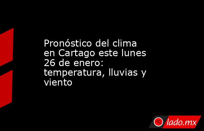 Para este lunes, se prevé que en Cartago habrá un 25% de posibilidad de lluvia, así como una temperatura máxima de 23 centígrados y una mínima de 14°. La nubosidad será del 59% y por la noche habrá una posibilidad del 25% de lluvias.