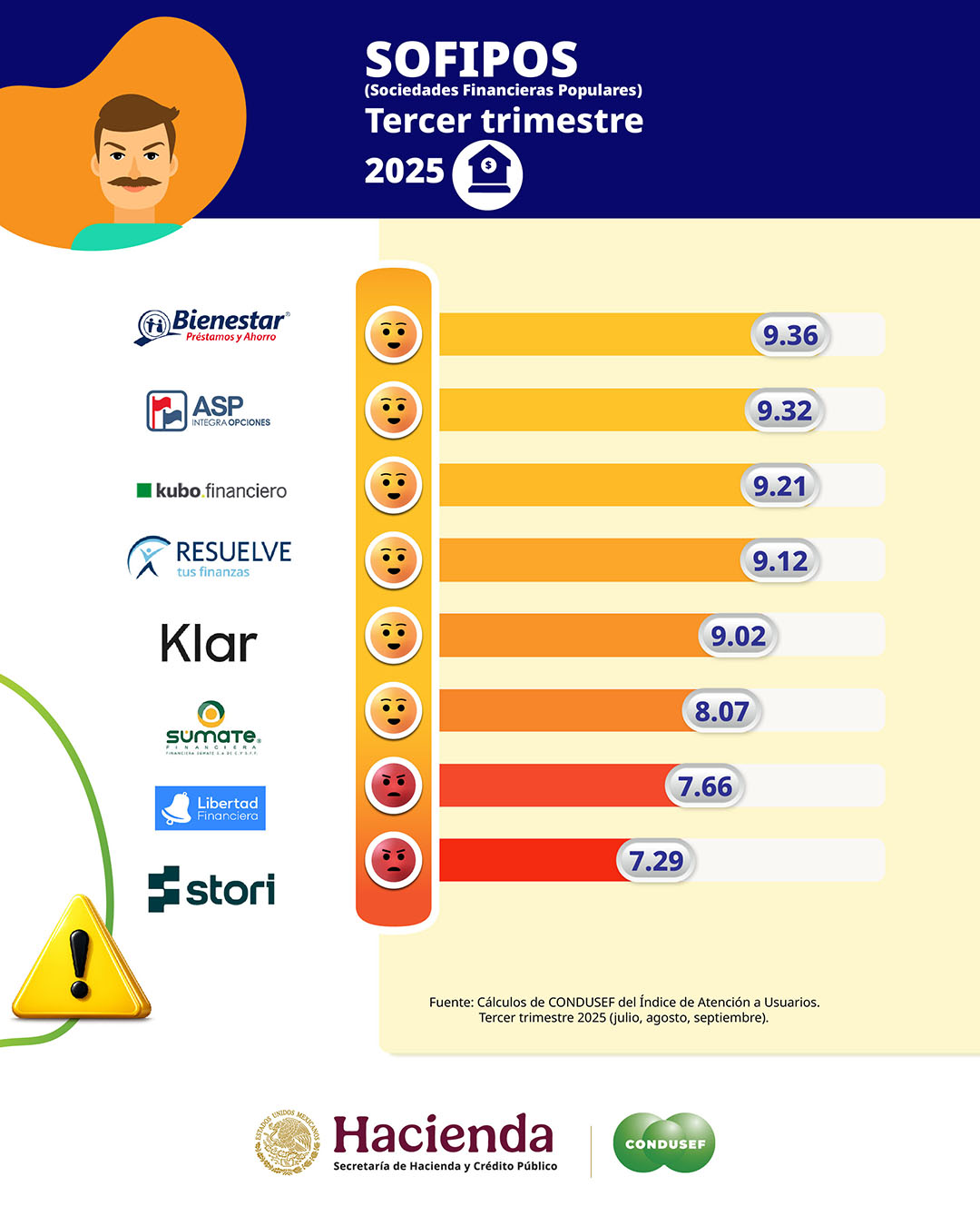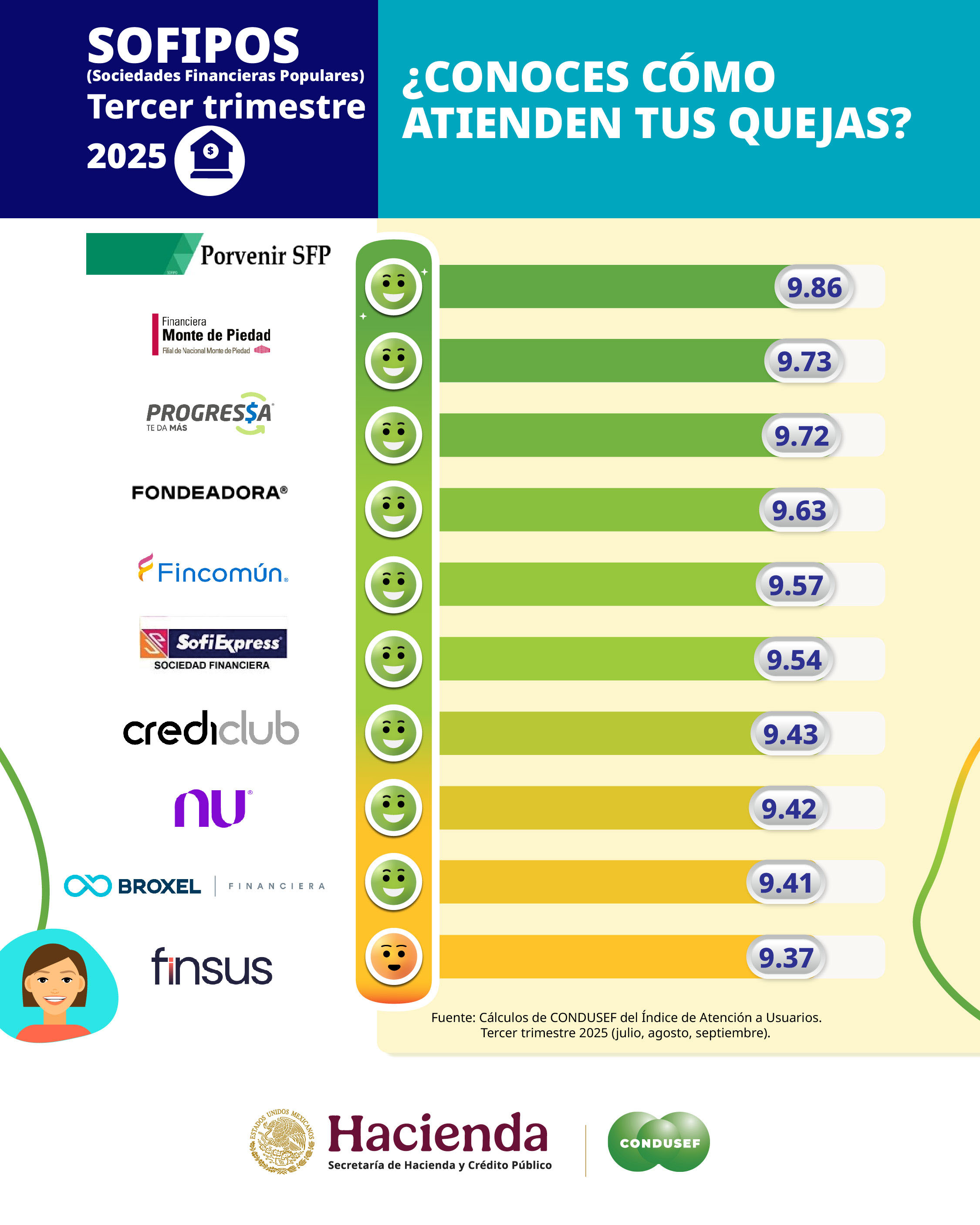 Entre las instituciones con mejor desempeño en atención a usuarios, destacan las siguientes Sofipos, de acuerdo con el IDATU del tercer trimestre de 2025: SFP Porvenir: 9.86 puntos. Financiera Monte de Piedad: 9.73 puntos. Caja Progressa: 9.72 puntos. Fondea Technologies: 9.63 puntos. Fincomún Servicios Financieros: 9.57 puntos. J.P. Sofiexpress: 9.54 puntos. Crediclub: 9.43 puntos. NU México Financiera: 9.42 puntos.