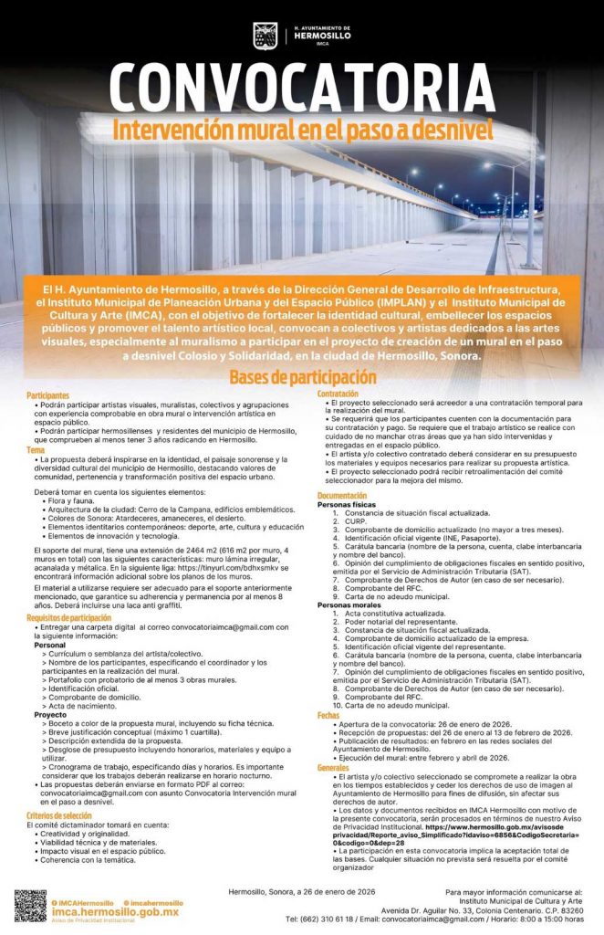 La convocatoria estará abierta hasta el 13 de febrero de 2026. Las bases completas pueden consultarse en las redes sociales del IMCA y del Ayuntamiento de Hermosillo, así como en el sitio oficial imca.hermosillo.gob.mx.
