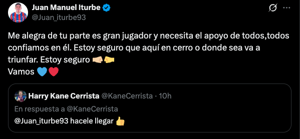 "Me alegra de tu parte, es gran jugador y necesita el apoyo de todos, todos confiamos en él. Estoy seguro que aquí en Cerro o donde sea va a triunfar. Estoy seguro. ¡Vamos!", escribió "Itu" a una publicación del usuario "Harry Kane Cerrista", que pidió el apoyo de los hinchas azulgranas al volante de 23 años, que no viene pasando por un buen momento futbolístico.