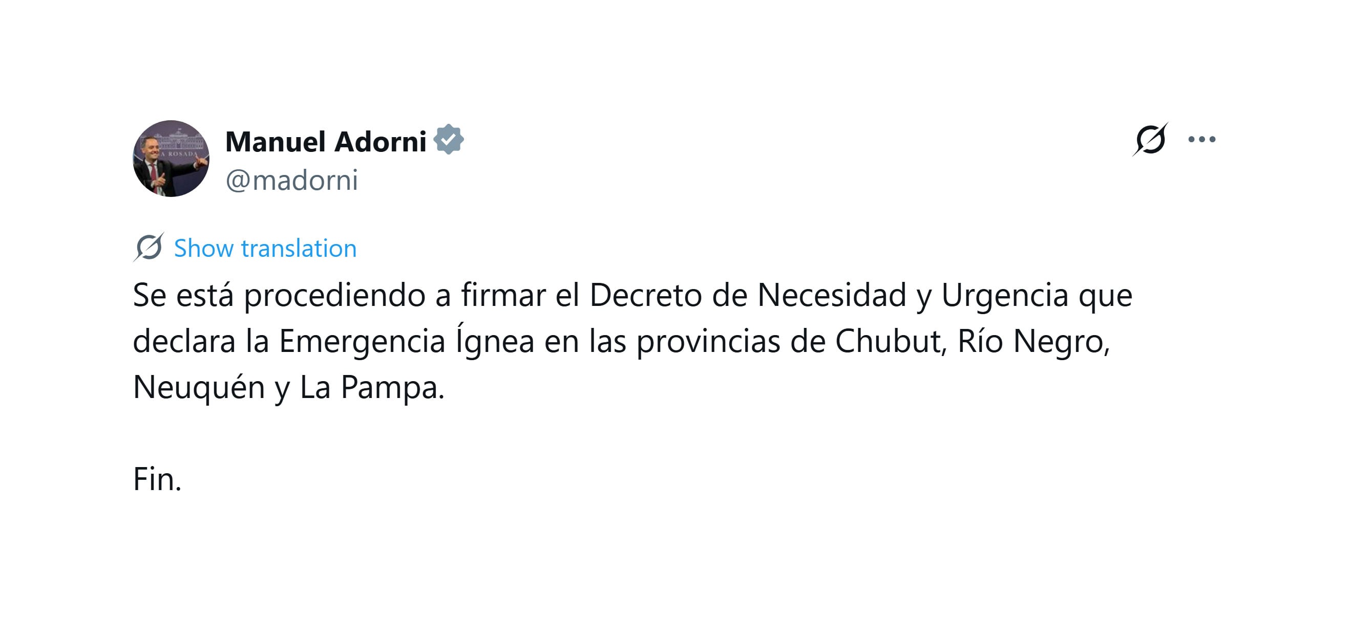 El Gobierno nacional avanzó en la decisión de declarar la Emergencia ígnea en las provincias de Chubut, Río Negro, Neuquén y La Pampa a través de un Decreto de Necesidad y Urgencia (DNU), en respuesta al devastador impacto de los incendios forestales que ya consumieron más de 45 mil hectáreas en la región. El jefe de Gabinete, Manuel Adorni, confirmó que el decreto “está listo para ser firmado y publicado”, anticipando así una medida que busca agilizar la llegada de recursos a los territorios afectados y atender la urgencia de la situación.