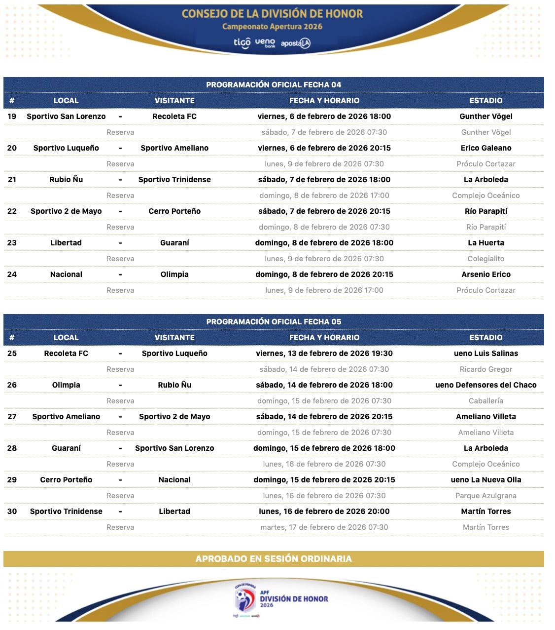 El Consejo de la División de Honor de la Asociación Paraguaya de Fútbol programó dos capítulos más del torneo Apertura 2026; la cuarta y la quinta fecha, que se jugarán en la primera quincena de febrero, con Sportivo 2 de Mayo y Guaraní ya en plena acción en la Copa Libertadores.