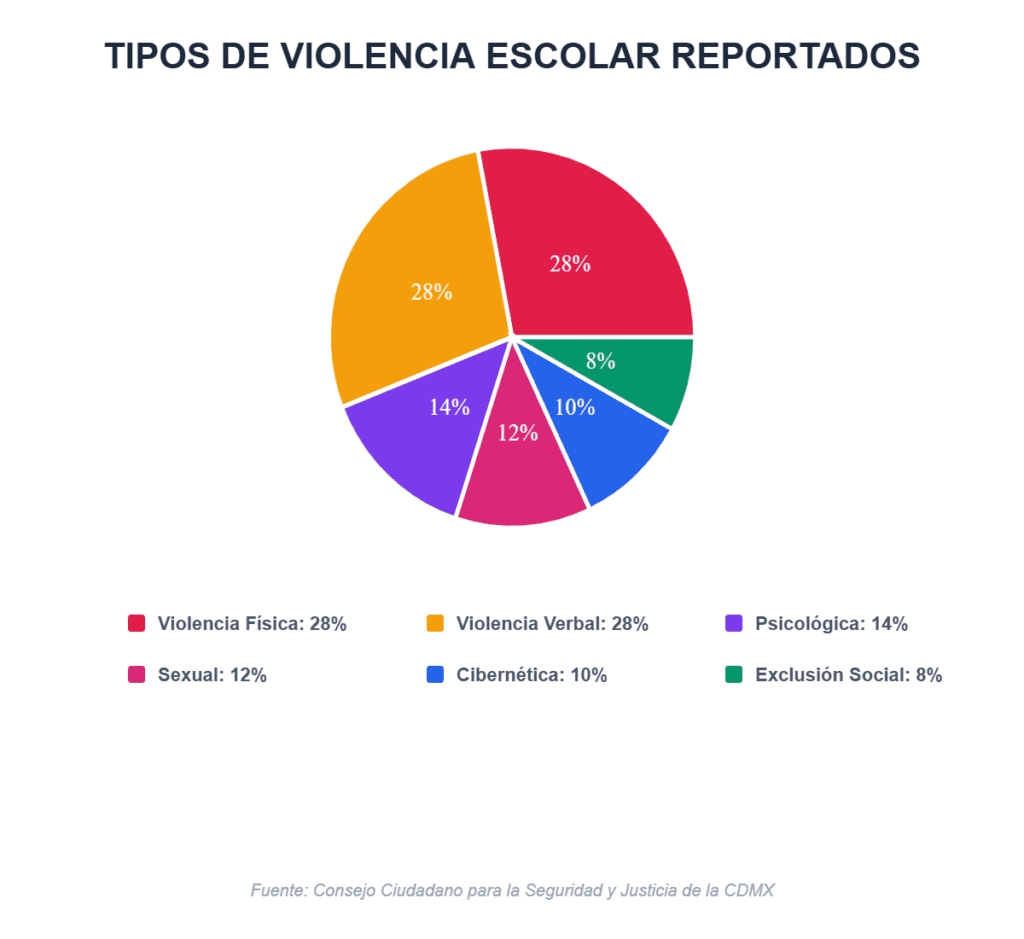 El Consejo Ciudadano para la Seguridad y Justicia de la Ciudad de México, reporta, a propósito del Día escolar de no violencia, que la secundaria se mantiene como el campo de batalla principal, concentrando el42 por ciento de los casos que tienen registrados. Los tipos de violencia reportados se dividen como sigue: