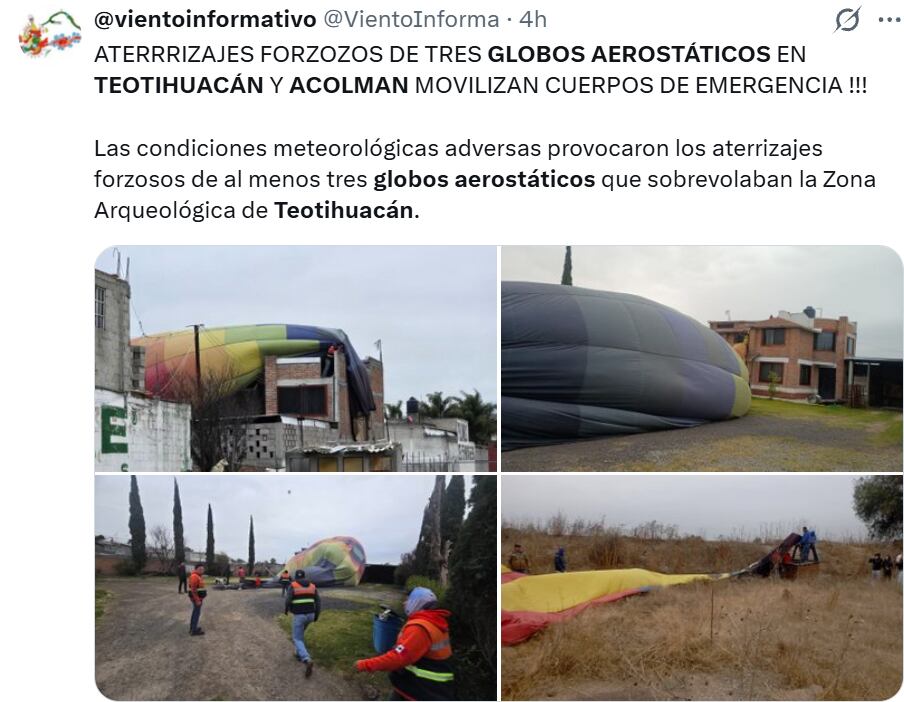 Uno de los incidentes que más atención generó ocurrió en el fraccionamiento Real del Valle, dentro del municipio de Acolman, donde un globo de la empresa Volaré descendió de forma controlada, pero terminó sobre el techo de una vivienda de dos niveles. Las imágenes del globo cubriendo la edificación circularon rápidamente en redes sociales, reflejando el impacto visual de la situación. En otro caso, una aeronave fue arrastrada varios kilómetros fuera de su trayecto previsto y logró aterrizar en una zona abierta, en la periferia de la región de Teotihuacán.