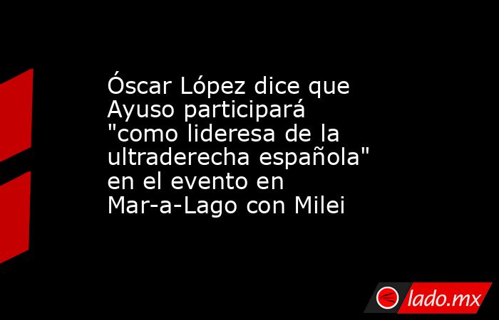 El ministro para la Transformación Digital y de la Función Pública y secretario general del PSOE-M, Óscar López, ha afirmado este miércoles que la presidenta de la Comunidad de Madrid, Isabel Díaz Ayuso, participará el martes "como lideresa de la ultraderecha española" en el evento que se celebra en el club Mar-a-Lago, donde se encuentra la residencia privada de Donald Trump en Florida, en el que participará el presidente de Argentina, Javier Milei.