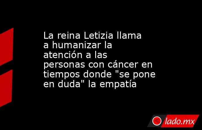 La reina Letizia ha llamado este miércoles a humanizar la atención a las personas con cáncer durante todo el proceso de la enfermedad, una acción que le parece "muy oportuna" en tiempos en los que "a veces da la sensación de que se pone en duda la capacidad de identificarse con alguien y compartir sus sentimientos, lo que el diccionario dice que es la empatía".