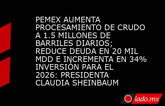 Ciudad de México, 4 de febrero de 2026.- La Presidenta Claudia Sheinbaum Pardo destacó que hoy Pemex es una empresa pública al servicio del pueblo de México, ya que como parte de su plan de fortalecimiento, en 2025 el procesamiento de crudo alcanzó 1.5 millones de barriles diarios, el más alto en su historia; redujo su deuda en más de 20 mil millones de dólares (mdd); y en 2026 aumentó 34 por ciento la inversión, lo que representa un monto de 425 mil millones de pesos (mdp).