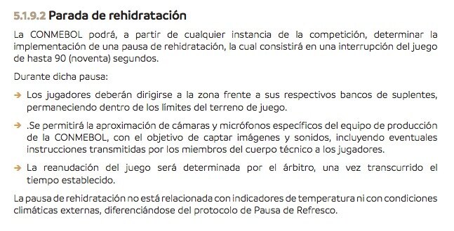 En la misma, los jugadores deberán seguir el mismo protocolo que la pausa de refresco, es decir ir hasta sus respectivos banco de suplentes manteniéndose dentro del campo de juego, pero se establece que las cámaras de televisión y micrófonos de producción de la Conmebol puedan acercarse a los bancos para captar imágenes y sonidos de lo que se habla entre los jugadores y el DT.