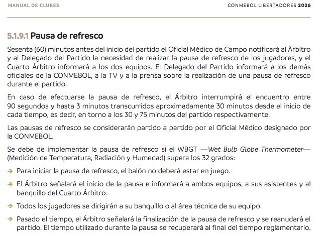 En el artículo 5.1.9.1 del Manual de Clubes de la Libertadores y Sudamericana 2026 se estipula la "Pausa de refresco", algo establecido ya desde hace unos años.