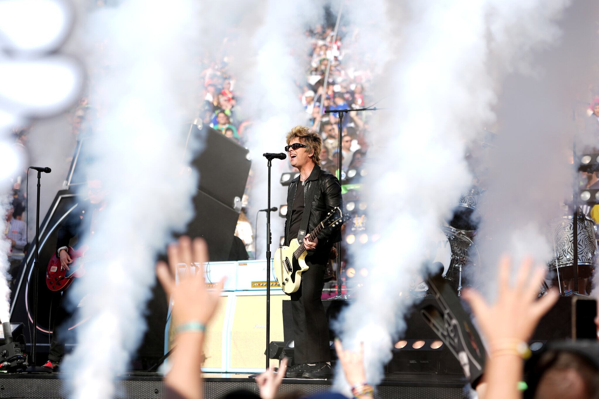 Pero dos días antes de esa presentación, en otro acto del fin de semana del Super Bowl, el líder de Green Day, Billie Joe Armstrong, tomó el micrófono para pedir a los agentes del Servicio de Inmigración y Control de Aduanas (ICE) que dejaran su trabajo.
