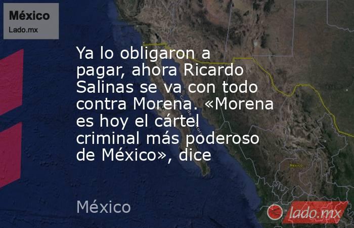 Ricardo Salinas Pliego ya dio un pago inicial de 10 mil 400 millones 630 mil 537 pesos de los 32 mil millones que debe de pagar al Sistema de Administración Tributaria. Quizá por ello el empresario se siente con derecho para criticar al partido en el poder. En un mensaje en sus redes sociales Salinas Pliego anotó: «El @PartidoMorenaMx es un cártel criminal. No nos confundamos: no es que esté infiltrado por el crimen organizado. Morena es hoy el cártel criminal más poderoso de México, y está dirigido desde Macuspana en Tabasco.