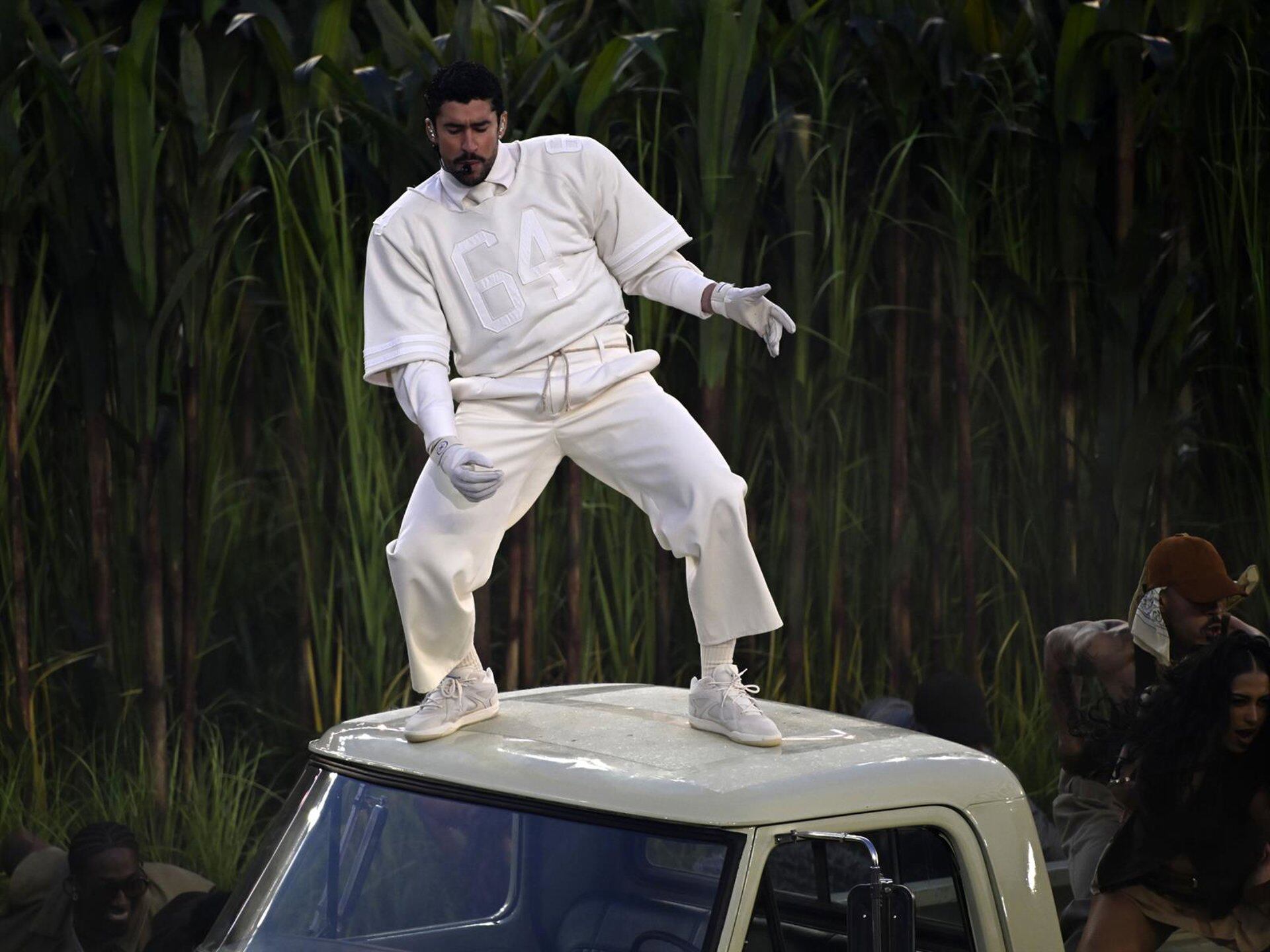 Días después de ganar el Grammy a Mejor Álbum por "Debí Tirar Más Fotos", Bad Bunny convirtió el Levi"s Stadium de Santa Clara, California, en una fiesta latina a la que se sumaron Lady Gaga y Ricky Martin, y en la que además de celebrar una boda en directo, y convertir el césped del estadio en una frondosa "selva" inspirada en la cultura puertorriqueña, acabó manteado después de interpretar algunos de sus grandes éxitos en español: "NUEVAYoL", "Tití me preguntó", "Voy a Llevarte Pa" PR", o "Yo perreo sola", además de incluir fragmentos de otros temas de reggeaton latinos como "Dale don dale" de Don Omar, o "Gasolina" de Daddy Yankee.