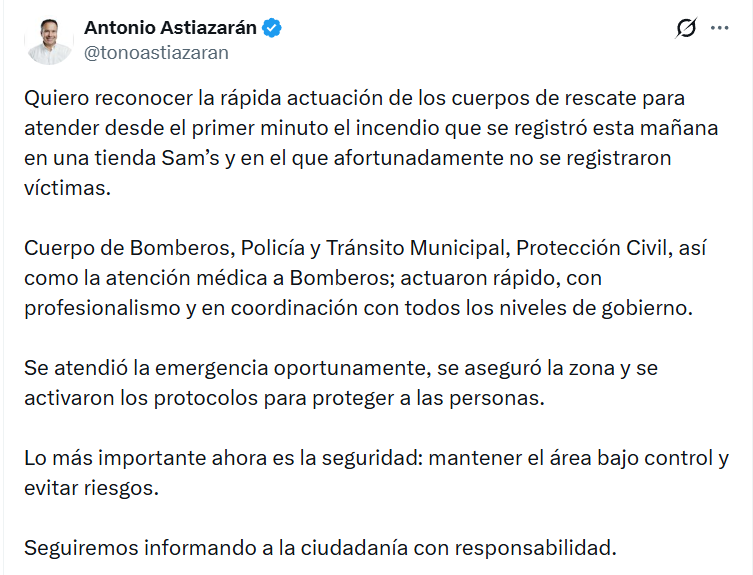 “Quiero reconocer la rápida actuación de los cuerpos de rescate para atender desde el primer minuto el incendio que se registró esta mañana en una tienda Sam’s y en el que afortunadamente no se registraron víctimas”, expresó.