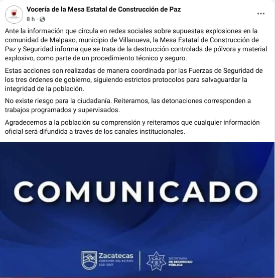 “Ante la información que circula en redes sociales sobre supuestas explosiones en la comunidad de Malpaso, municipio de Villanueva, la Mesa Estatal de Construcción de Paz y Seguridad informa que se trata de la destrucción controlada de pólvora y material explosivo, como parte de un procedimiento técnico y seguro”.