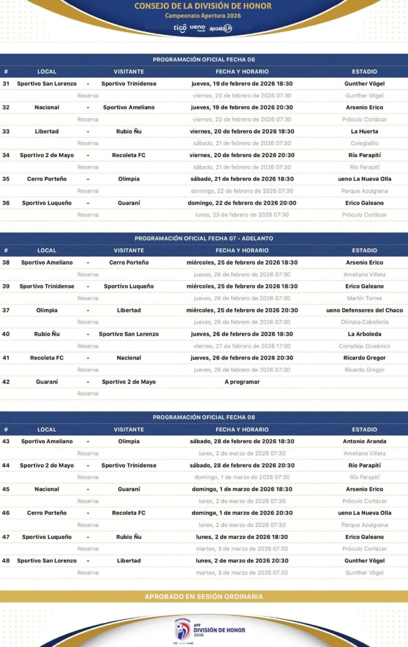 La Asociación Paraguaya de Fútbol dio a conocer el calendario del campeonato en las próximas tres fechas (6, 7 y 8). Claramente sobresale el superclásico del próximo 21 de Febrero en Barrio Obrero.