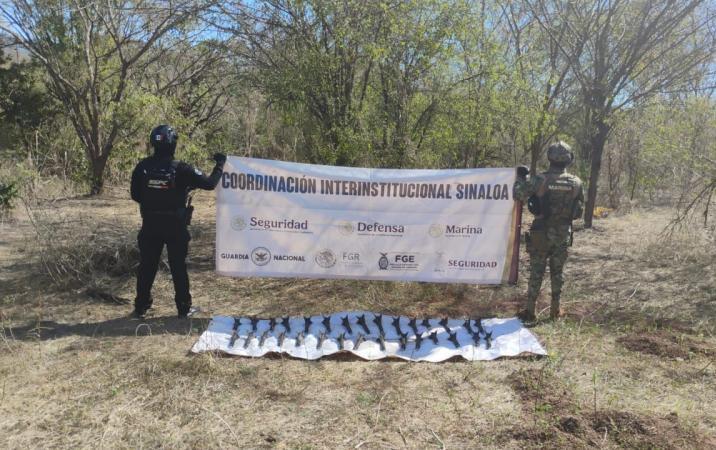 CONCORDIA, SIN.- Elementos de infantería de la Armada de México aseguraron 30 artefactos explosivos improvisados en el poblado El Verde, municipio de Concordia, Sinaloa, en acciones realizadas en coordinación con la Secretaría de Seguridad y Protección Ciudadana (SSPC).