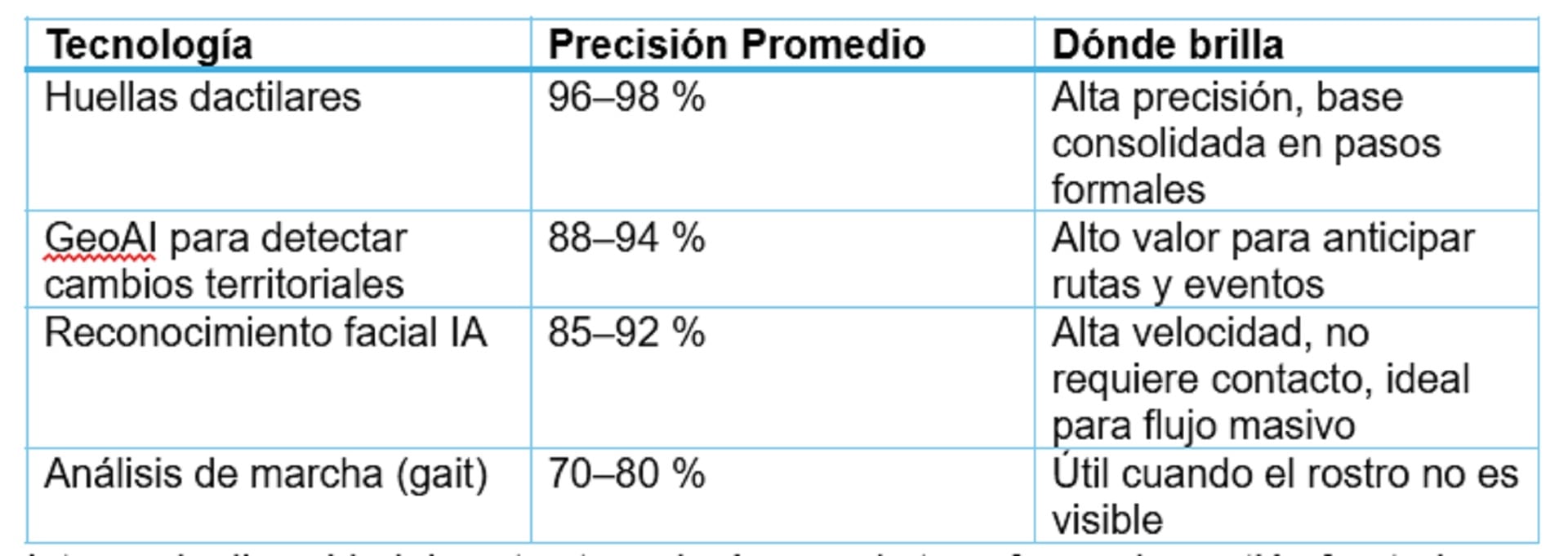 La tabla compara tecnologías biométricas e inteligencia territorial en la frontera argentina, enfocándose en precisión y contexto óptimo. El reconocimiento facial por IA es rápido y preciso en multitudes; las huellas dactilares son las más fiables en ámbitos formales con bases de datos accesibles. El análisis de marcha tiene menor precisión, pero es útil cuando no se reconoce el rostro. En la escala territorial, la GeoAI detecta cambios territoriales (precisión 88-94%) y predice rutas o sucesos atípicos.
