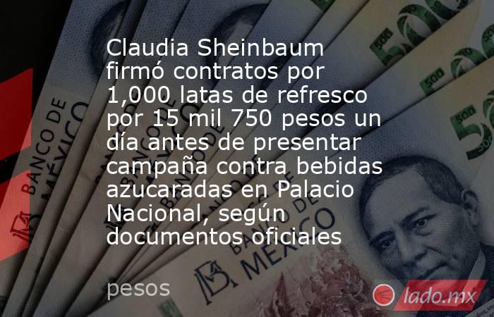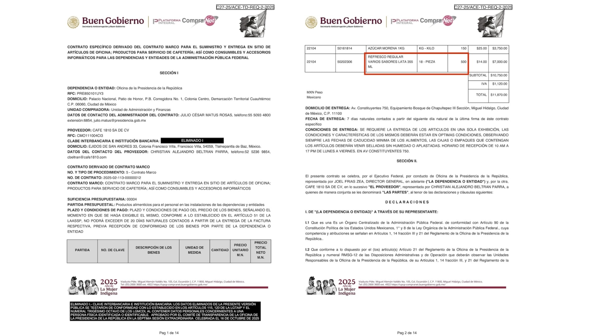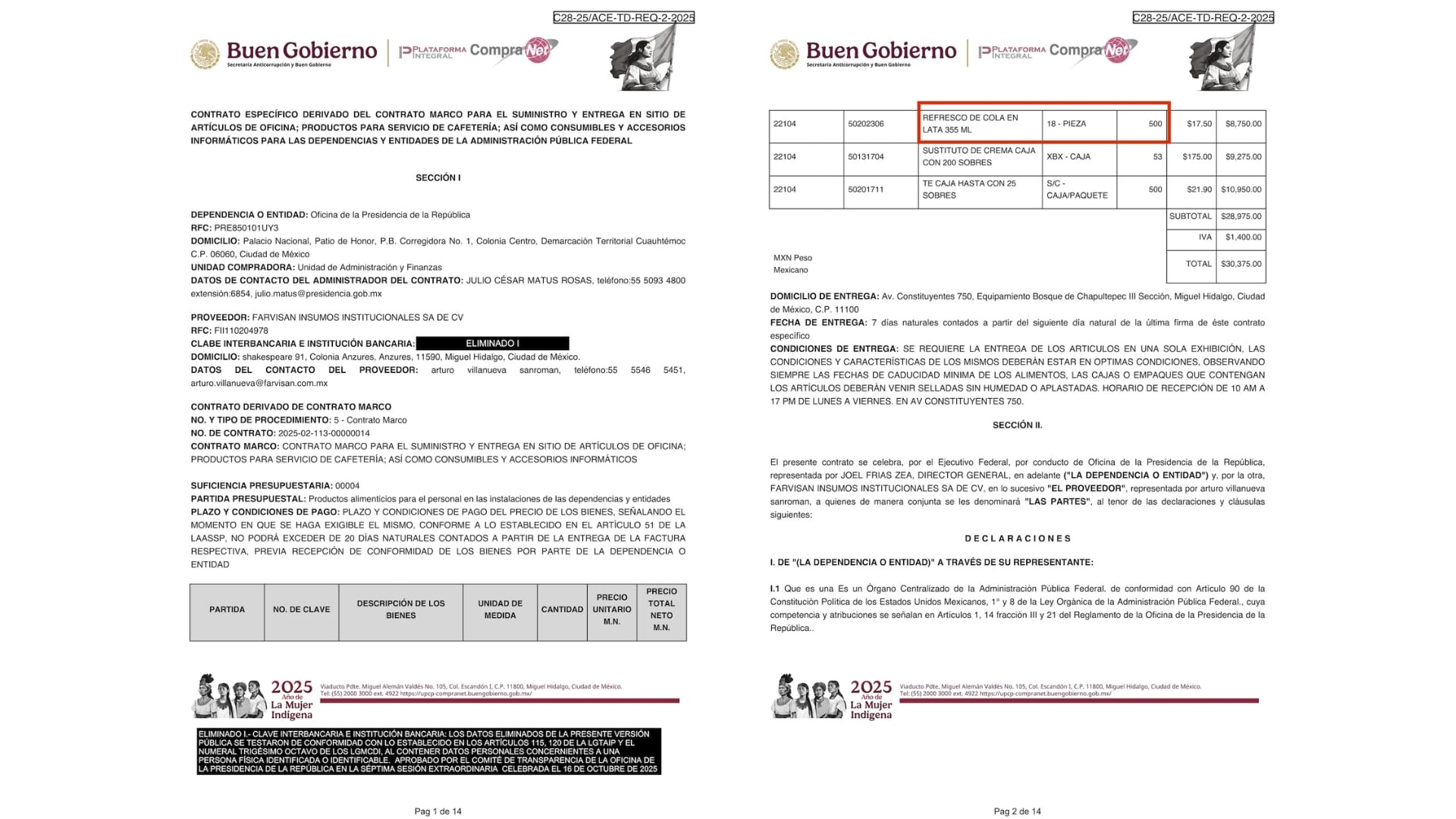 La Oficina de la Presidencia de la República, encabezada por Claudia Sheinbaum, formalizó el 18 de agosto de 2025 la adquisición de 1,000 latas de refresco de 355 ml por un monto de 15 mil 750 pesos más IVA, de acuerdo con contratos oficiales.