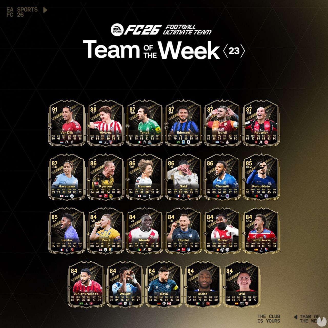Son los siguientes:CB: Virgil van Dijk 91ST: Julián Álvarez 88CDM: Sandro Tonali 87CM: Éderson José dos Santos 87*ST: Mauro Icardi 87*CM: Géraldine Reuteler 87*CDM: Yui Hasegawa 87RB: Julian Ryerson 86*RM: Maika Hamano 86*LW: Wesley Saïd 86ST: Youssef Chermiti 86CAM: Pedro Lomba Neto 85GK: Brice Samba 85CM: Louis Reed 84CB: Nobel Mendy 84RB: Vladimír Coufal 84CDM: Jorthy Mokio 84CAM: Santi García González 84ST: José Francisco dos Santos Júnior 84ST: Haji Wright 84CAM: Fatih Kaya 84RM: Yakou Méïté 84ST: Lucía Wifi Moral Ruíz 84¿Qué es el Team of the Week?El Team of the Week (también conocido simplemente por las siglas TOTW), para quien no lo sepa, es un evento que EA Sports pone en marcha cada semana para darle más vida al Ultimate Team de EA Sports FC 26.