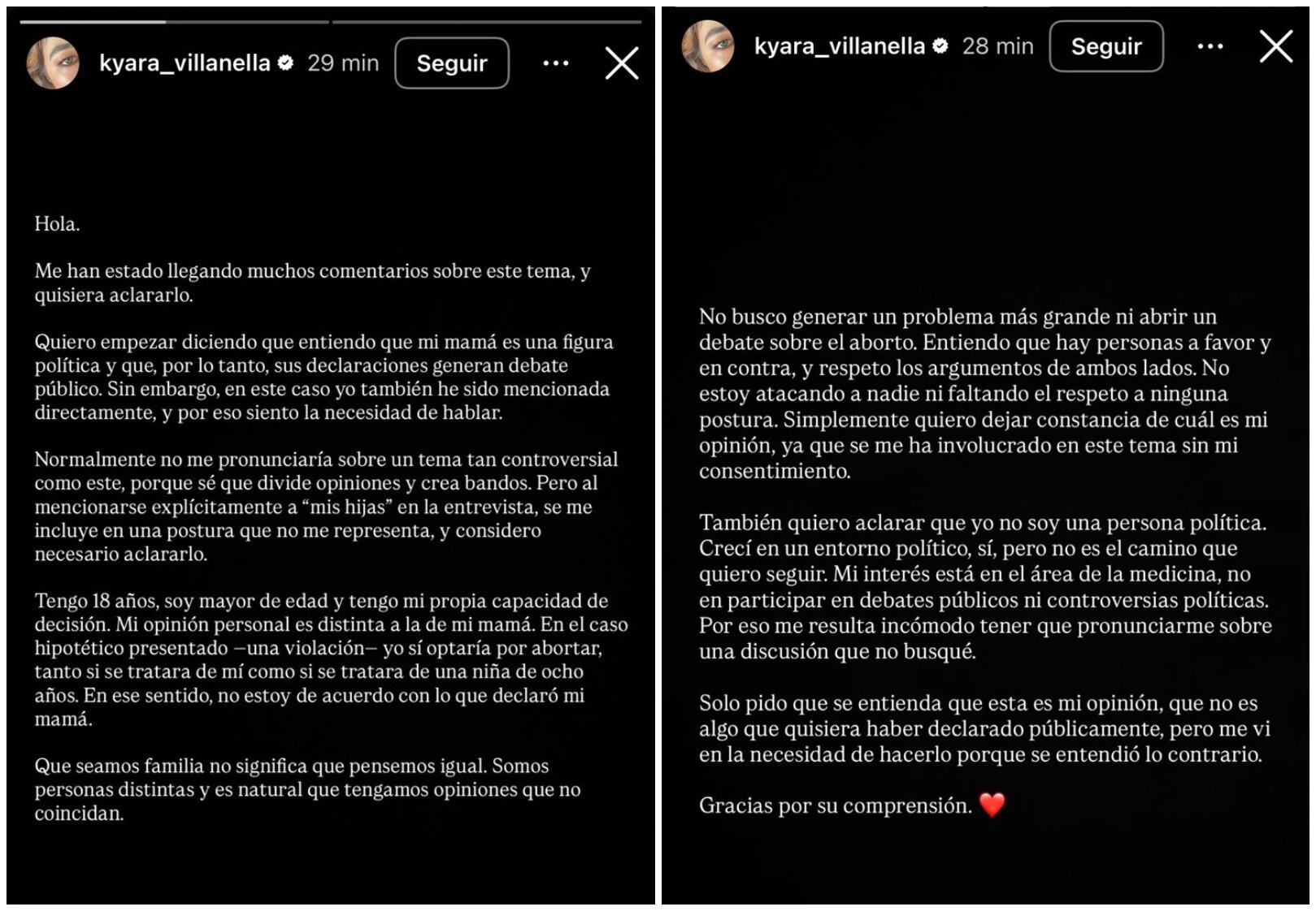 Sin embargo, Kyara Villanella, de 18 años, utilizó sus redes sociales para precisar que, aunque entiende el rol político de su madre, ella posee una capacidad de decisión independiente. “Tengo 18 años, soy mayor de edad. Yo sí optaría por abortar, tanto si se tratara de mí como si se tratara de una niña de ocho años. En ese sentido, no estoy de acuerdo con lo que declaró mi mamá”, manifestó tajantemente a través de su cuenta de Instagram.