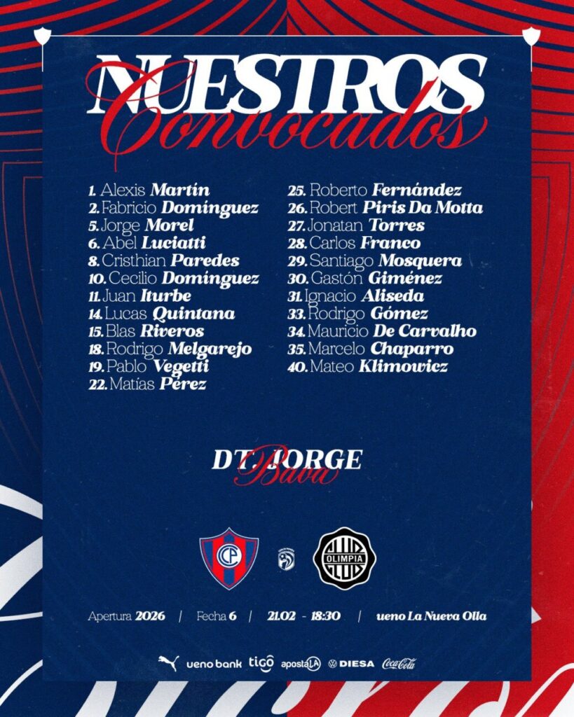 Cerro Porteño dio a conocer la lista de concentrados horas antes del duelo ante Olimpia en la Nueva Olla.