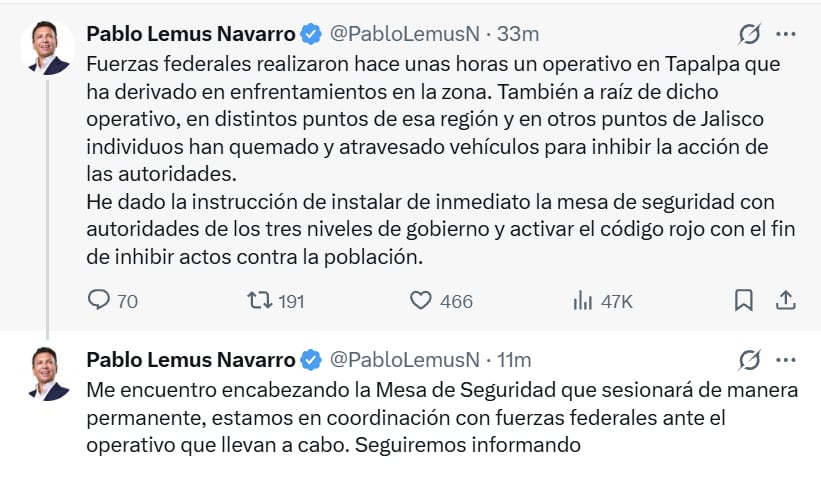 Ante la magnitud de los hechos, Pablo Lemus instruyó la inmediata instalación de la mesa de seguridad, integrada por representantes de los tres órdenes de gobierno. Además, se activó el código rojo en toda la entidad, medida que busca reforzar la vigilancia y prevenir nuevos actos violentos dirigidos contra la población civil. El gobernador subrayó que el operativo de seguridad se mantiene coordinado y que el objetivo principal es restablecer la normalidad en las zonas afectadas.