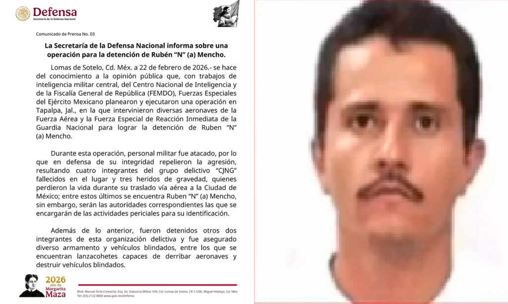La Secretaría de la Defensa Nacional (DEFENSA) confirmó la muerte de Nemesio Rubén Oseguera Cervantes, alias “El Mencho”, identificado como líder del Cártel Jalisco Nueva Generación (CJNG), tras un operativo militar realizado en Tapalpa, Jalisco.
