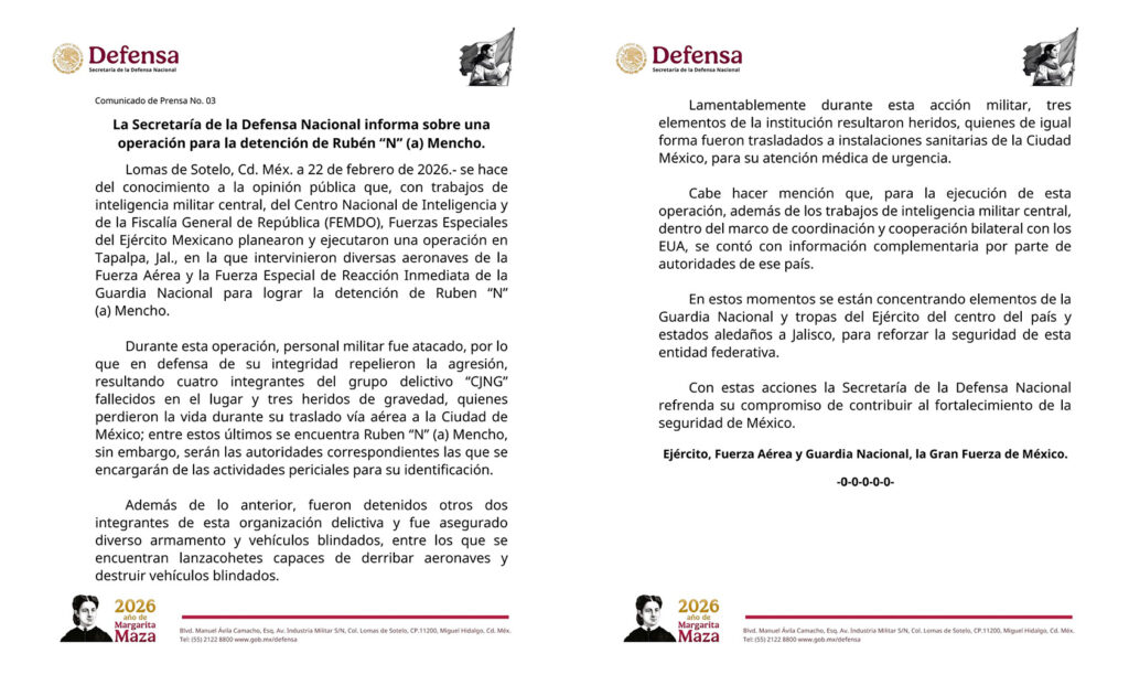 Finalmente, la DEFENSA informó que se concentran elementos adicionales de la Guardia Nacional y del Ejército en Jalisco y estados aledaños para reforzar la seguridad y prevenir posibles reacciones del grupo criminal. La institución reiteró su compromiso de contribuir al fortalecimiento de la seguridad nacional.