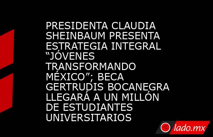 Ciudad de México, 24 de febrero de 2026.- La Presidenta de México, Claudia Sheinbaum Pardo, presentó la estrategia integral Jóvenes Transformando México, con el que se estima, este año, alejar de la violencia a 350 mil jóvenes, particularmente de entre 15 y 17 años, con acciones como la creación de 100 Bachilleratos Nacionales Margarita Maza, 100 Centros Comunitarios “México imparable” y la incorporación de 100 mil jóvenes a “Boxeando por la paz”. Además, anunció que la Beca de apoyo en transporte Gertrudis Bocanegra se ampliará para llegar a un millón de estudiantes de Educación Superior.
