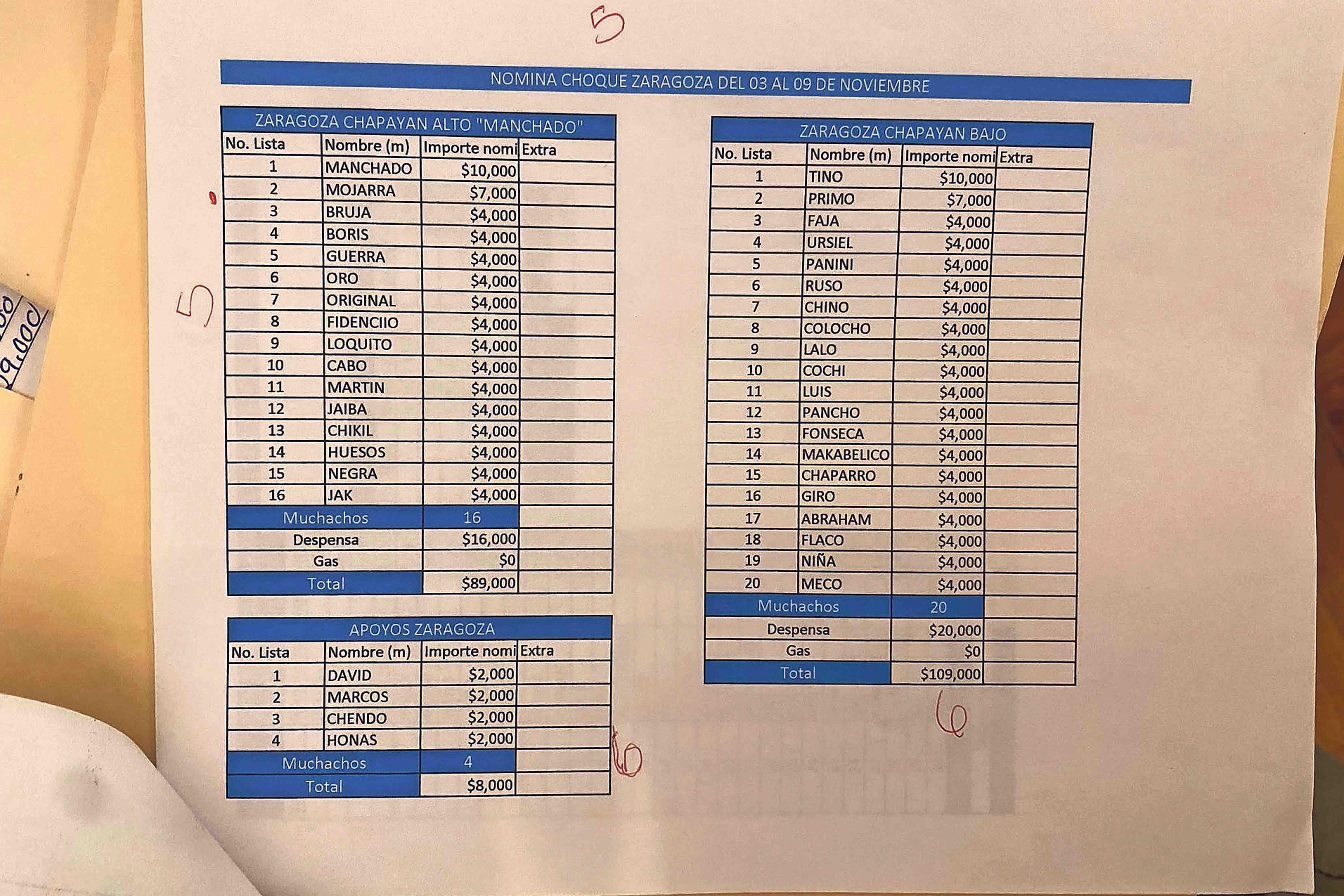 El registro de gastos, dividido por semanas, indica que en Tapalpa operaban entre 30 y 32 halcones (personas dedicadas a la vigilancia), a quienes se les pagaba entre 2 mil 500 y 3 mil pesos por semana; además de 26 “muchachos de choke” (pistoleros), con un sueldo de 4 mil pesos semanales, y un comandante que recibía 6 mil pesos por semana.
