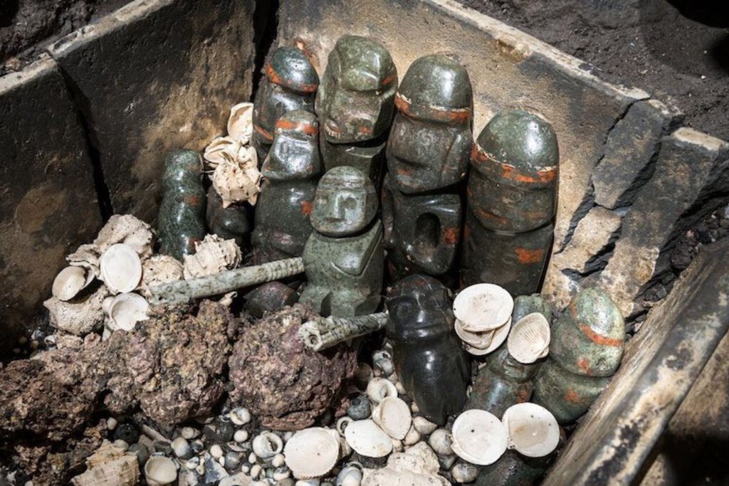Se trata de tres cofres de piedra o tepetlacalli que contenían 43 esculturas de piedra verde estilo mezcala, que constituyen lo pudo ser la ofrenda más grande realizada en la época de Motecuhzoma Ilhuicamina, también conocido como Moctezuma I, huei tlatoani de Tenochtitlan.