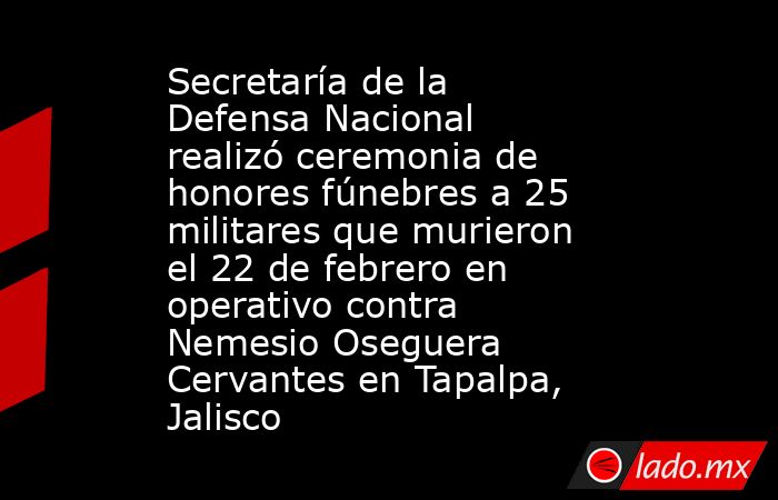 La Secretaría de la Defensa Nacional (Sedena) llevó a cabo una Ceremonia de Honores Fúnebres en memoria de los 25 militares que perdieron la vida el pasado 22 de febrero durante un operativo en Tapalpa, Jalisco, en el que murió Nemesio Oseguera Cervantes, identificado por las autoridades como líder del Cártel Jalisco Nueva Generación (CJNG).
