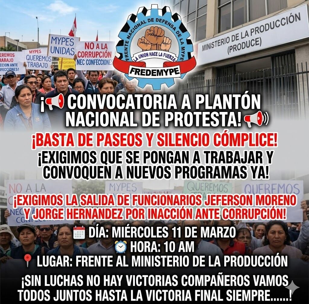 Los gremios de medianas y pequeñas empresas (mypes) han programado un plantón en las inmediaciones del Ministerio de la Producción para este miércoles 11 de marzo a las 10:00 horas, a raíz de la presunta corrupción en el programa Compras a MYPErú denunciadas ante la Contraloría.